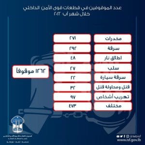 نتيجة الاستقصاءات والتحريّات المكثّفة، تمكّنت قطعات قوى الأمن الدّاخلي في خلال شهر آب المنصرم من إلقاء القبض على /1262/ شخصًا بجرائم مختلفة منها: قتل ومحاولة قتل، وسرقة، وسلب، ومخدّرات، وتهريب أشخاص، وإطلاق نار، وعنف أُسري، وغيرها…