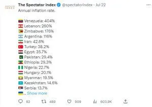 “نشر موقع “The Spectator Index” لائحة بالدول التي تُعاني من أعلى مستويات التضخم سنوياً، وقد احتل لبنان المرتبة الثانية بنسبة 260%.