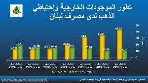 في سياقٍ آخر، تُبيِّن ميزانيّة مصرف لبنان تراجعاً بنسبة 1.12% (241.26 مليون د.أ.) في قيمة إحتياطاته من الذهب إلى 21.37 مليار د.أ. (1،912.82 ترليون ل.ل.) في ظلّ الإنخفاض في أسعار الذهب على إثر تراجع إحتماليّة أن يقوم الفيديرالي الأميركي بخفض أسعار الفائدة.
