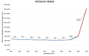 ويقدر التقرير كلفة صنع الفتوش لعائلة صغيرة مؤلفة من خمسة أشخاص عند بداية شهر رمضان هذا العام حوالي 18500 ليرة مقارنة مع 6000 ليرة في الـ 2020 وحوالي 4500 ليرة في الـ 2019.