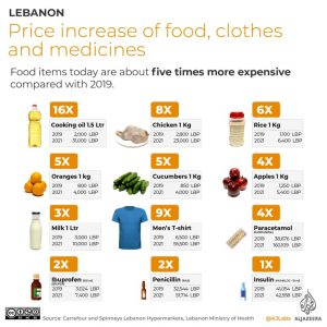 في السياق نفسه، يوضح “إنفوغرافيك” آخر أنّ سعر الزيت النباتي تضاعف 16 مرة، أمّا سعر الدجاج فـ8 مرات، وسعر الأرز 6 مرات. الدواء أيضاً تأثّر بحسب تقرير “الجزيرة” المستند إلى أرقام وزارة الصحة، إذ يوضح أنّ سعر الـ”إيبوبروفين” (مسكن للآلام) تضاعف مرتين.