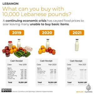 ويبيّن التقرير أنّ الليرة اللبنانية فقدت 80% من قيمتها، لافتاً إلى أنّ أسعار المواد الغذائية تضاعفت 5 مرات اليوم، فلا تكفي 10 آلاف ليرة اليوم إلاّ لشراء ليتر من الحليب.