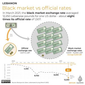 إلى ذلك، ينشر التقرير رسماً بيانياً لتدهور الليرة في السوق الموازية، إذ يظهر كيف بدأت الليرة تفقد قيمتها تدريجياً لتسجل 4100 ليرة أمام الدولار في السوق الموازية في أيار العام 2020، ثم 8750 ليرة في تموز الفائت و12250 ليرة في آذار الفائت، ما يعني أنّها فقدت 8 مرات قيمتها، باعتبار أنّ سعر الصرف الرسمي محدد عند 1500 ليرة للدولار.