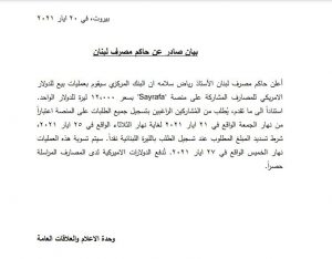 أعلن حاكم مصرف لبنان رياض سلامة أن البنك المركزي سيقوم بعمليات بيع للدولار الاميركي للمصارف المشاركة على منصة SAYRAFA بسعر 12000 ليرة للدولار الواحد.