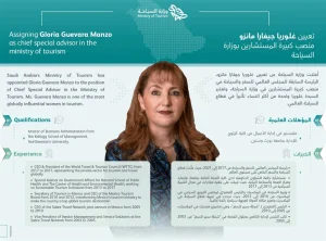 أعلنت وزارة السياحة السعودية عن تعيين السيدة غلوريا جيفارا مانزو، في منصب كبيرة المستشارين، لتساهم بخبرتها الواسعة مع فريق عمل الوزارة في الانتقال إلى المرحلة التالية من مسيرة تنمية قطاع السياحة في المملكة في إطار رؤية 2030.