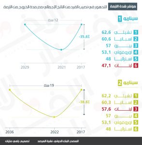 – السيناريو الثاني: هو سيناريو متشائم، يفترض بأن تكون سنة الحضيض في 2022. ووفق تقديرات البنك الدولي، سيشهد الناتج المحلي الإجمالي في لبنان انكماشاً إضافياً عن عام 2021 بنسبة 5% في الناتج المحلي، فيصبح الانخفاض في نصيب الفرد من الناتج المحلي بين عام 2017 (الذروة) وعام 2022 (الحضيض) 38.6%. وبحسب هذا السيناريو، يقدّر البنك أن مدّة الأزمة ستبلغ 19 سنة، وهو معدّل المدّة الزمنية للأزمات التي وقعت في الدول المصنّفة في المراكز العشرة الأولى. وينتج من هذه التقديرات أن مؤشّر «شدّة الأزمة» للبنان سيبلغ 57.6 نقطة، وهو رقم يضع الأزمة اللبنانية في المركز الثالث في تصنيف المؤشّر لأشدّ الأزمات منذ منتصف القرن التاسع عشر.