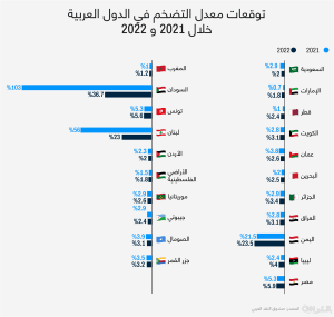 وبناء على التقرير، من المتوقع بقاء معدل التضخم في الدول العربية عند مستوى مرتفع خلال عام 2021 ليصل نحو 11%، بينما تشير التوقعات إلى تراجع معدل التضخم خلال عام 2022 ليصل إلى نحو 6.1%. امّا بالنسبة الى لبنان، فبلغت توقعات التضخم 56 بالمئة في 2021، ويتوقع التقرير أن تصل الى 23 بالمئة في العام المقبل.