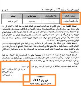 نُشر في الجريدة الرسمية قرار بصنع طابع بريدي عادي لـ”أبو ملحم وأم ملحم”، من فئة ألف ليرة لبنانية، بكمية 50 ألف طابع، ومقاس 3سم * 4 سم.